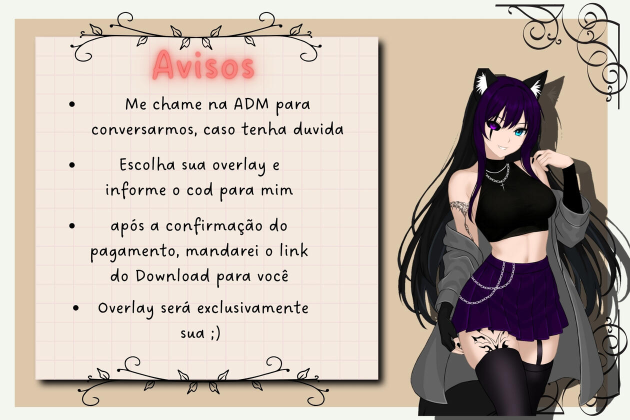 Ao clicar em "Encomendar" você será direcionado ao meu perfil do twitter, onde poderá me chamar na DM e dizer o código do overlay que te interessou ou caso tenha alguma dúvida.Overlays personalizadas terão o preço alterado de acordo com os detalhes que você queira no seu overlay.